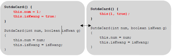 this(1, true); // SutdaCard(1, true)를 호출한다.